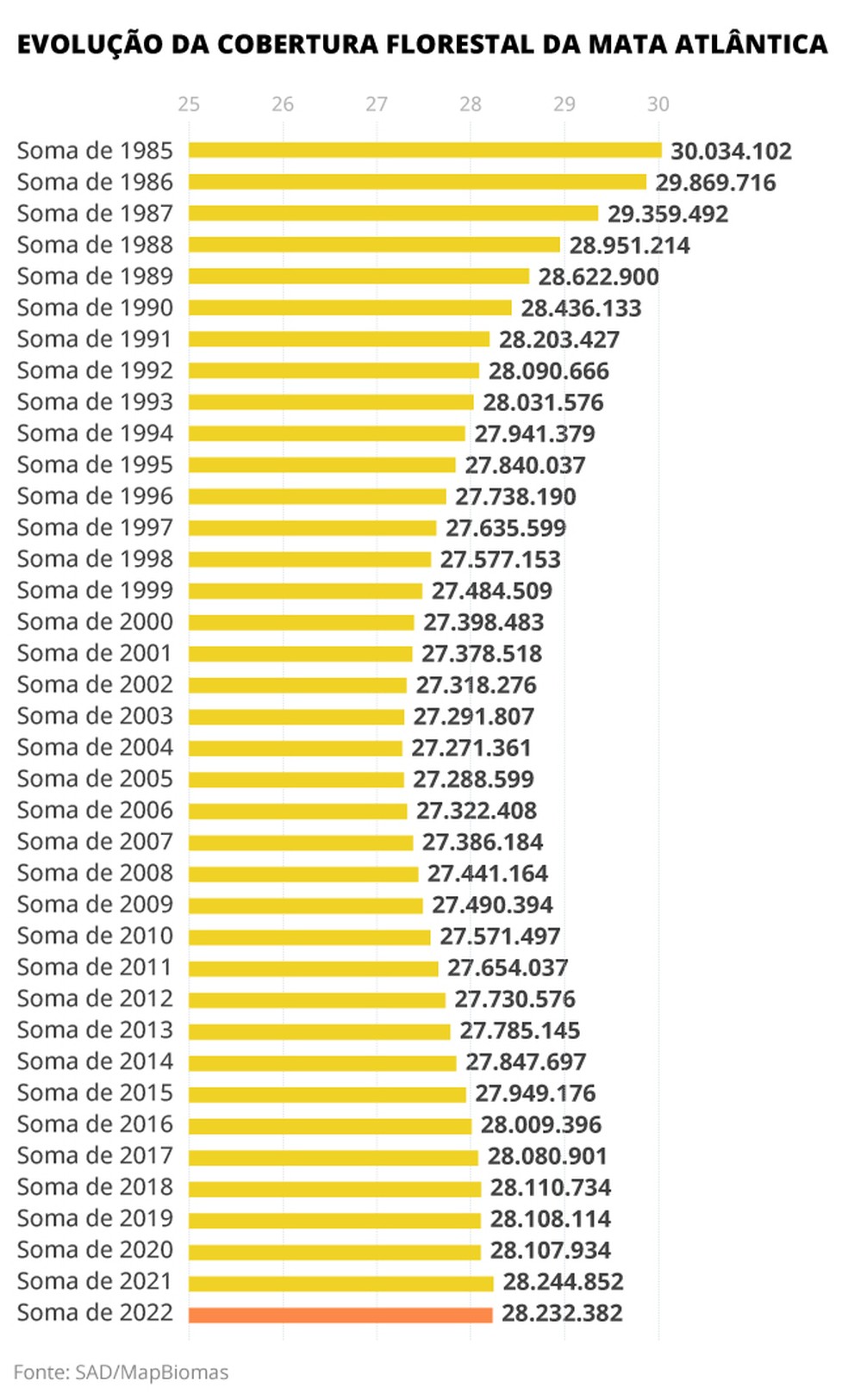 Evolução da cobertura florestal da Mata Atlântica — Foto: Editoria de arte— Restaurar a Mata Atlântica é melhorar o clima das cidades, aumentar a oferta de água, de lazer, de qualidade de vida e também uma oportunidade de negócios. O Brasil pode dar um exemplo para o mundo, com benefícios diretos para a população — ressalta Guedes.
