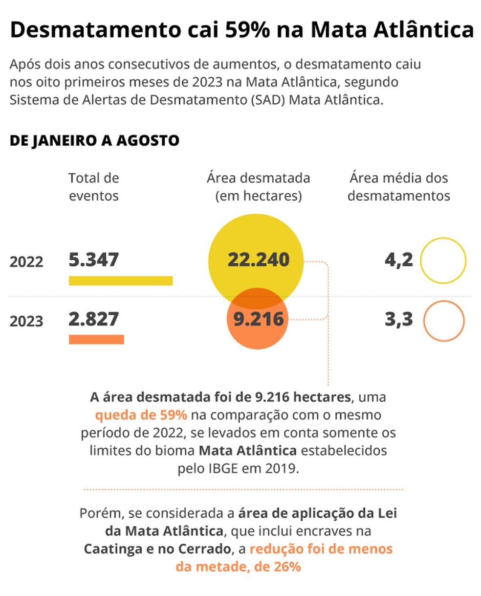 Desmatamento cai na Mata Atlântica — Foto: Editoria de arteOs bancos públicos têm acordos com o SAD. O Banco do Brasil, desde 2021; e o BNDES e a Caixa, a partir de dezembro de 2022. Rosa explica que os bancos privados não têm acordo, mas podem consultar gratuitamente o SAD.