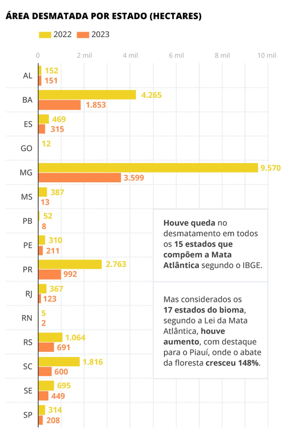 Área da Mata Atlântica desmatada por estado — Foto: Editoria de arteEle acrescenta que a Lei 11.428/2006, conhecida como Lei da Mata Atlântica, é a única legislação brasileira a tratar exclusivamente de um bioma. Graças a ela, o desmatamento na Mata Atlântica caiu consideravelmente e, desde sua aplicação, a floresta vem se regerando em áreas abandonadas ou restauradas.